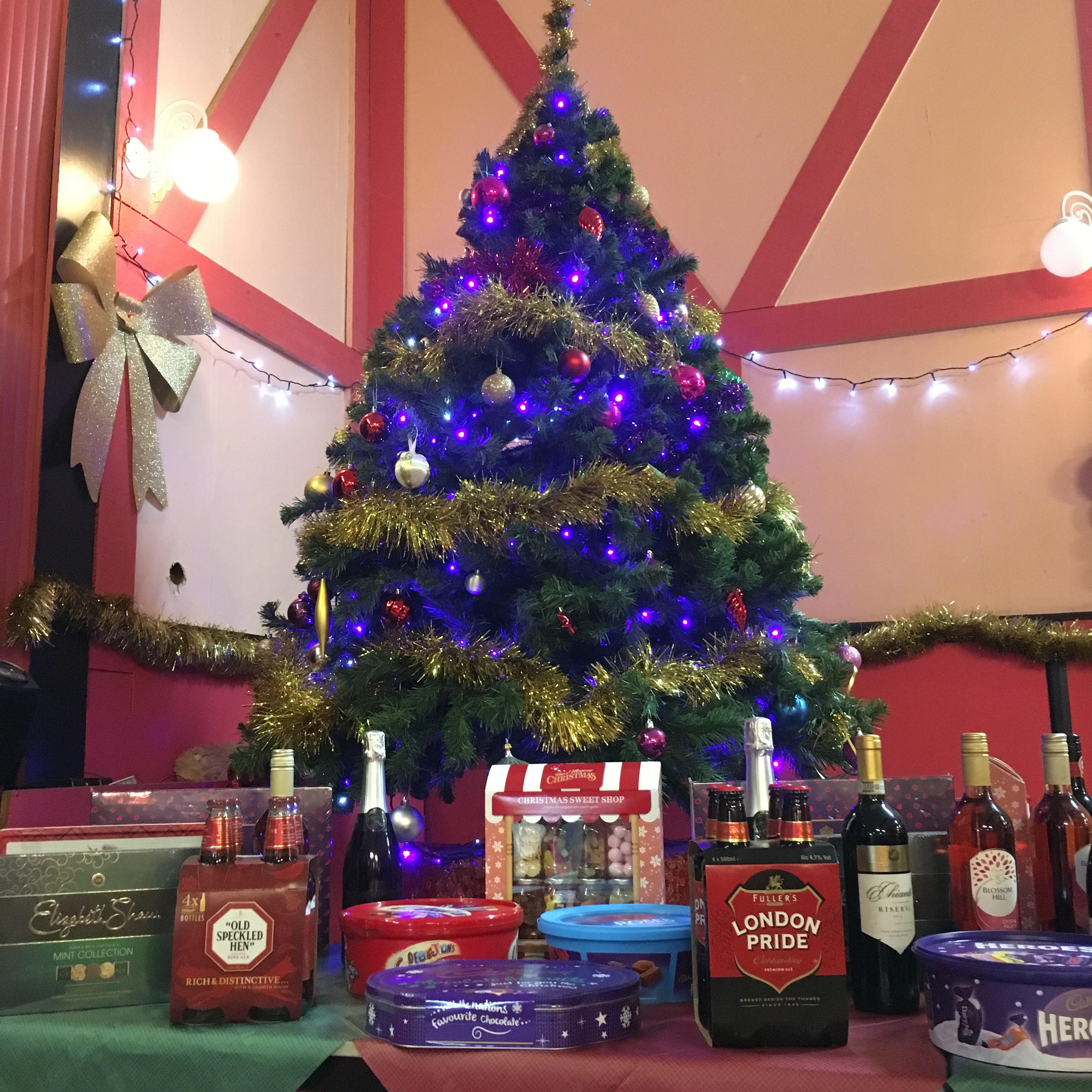 Raffle prizes and Christmas tree
